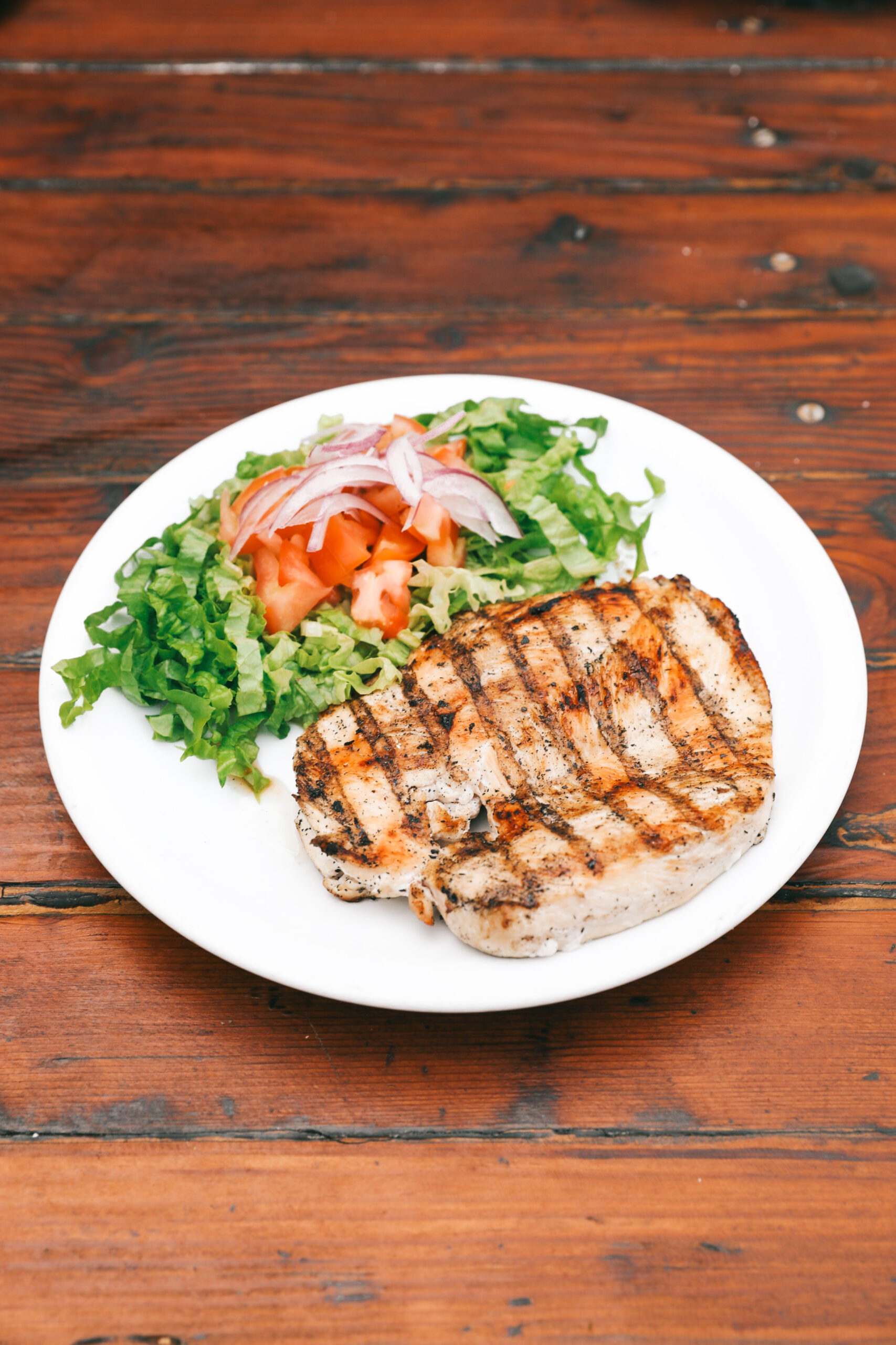 Pechuga de pollo a la parrilla, con guarnicion de papas o ensalada.